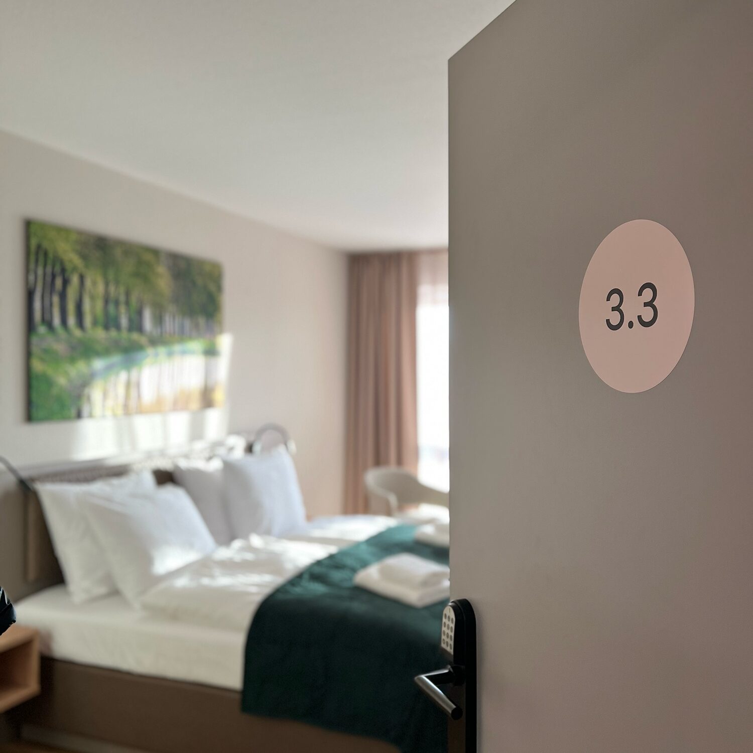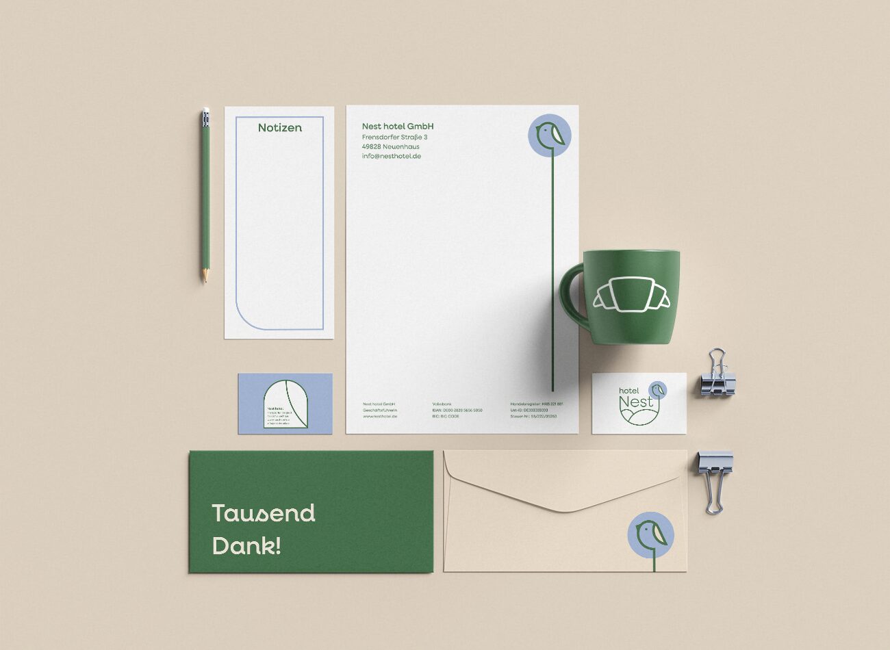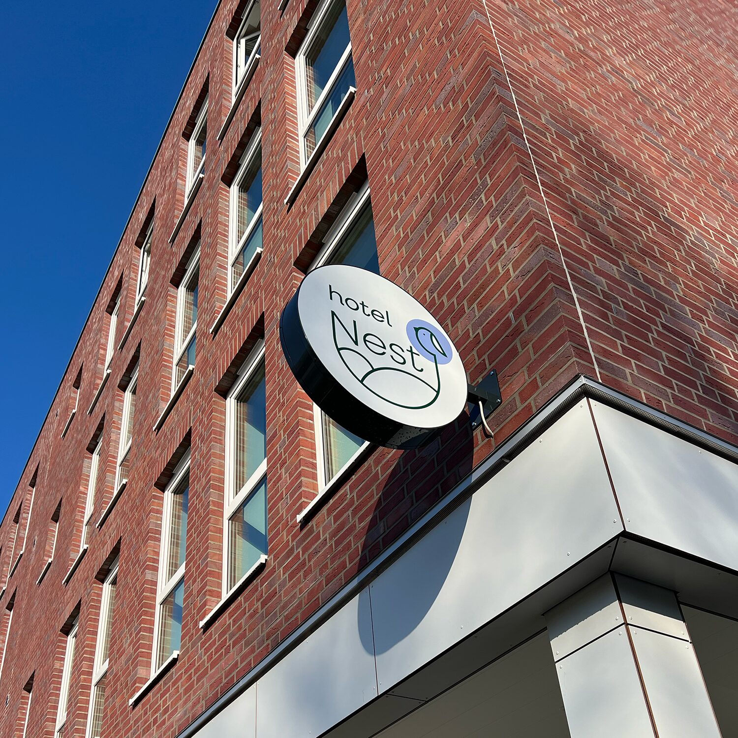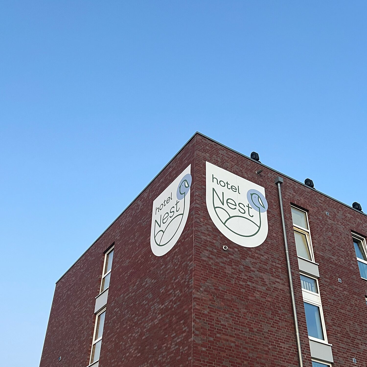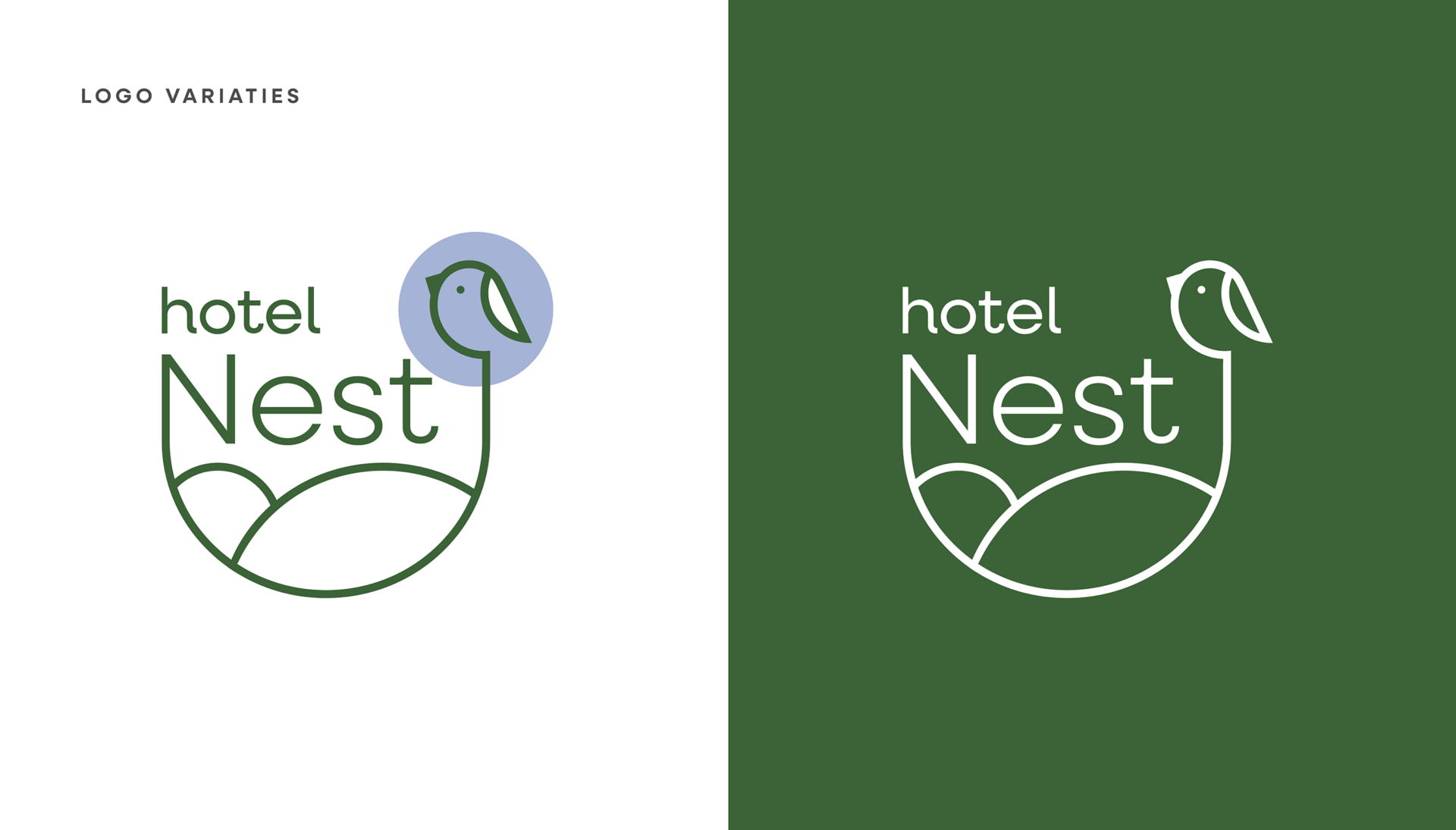Hotel Nest gaat over geborgenheid en thuiskomen. ‘Nest’ betekent in het Nederlands, Duits en Engels hetzelfde – precies de brug tussen beide landen. Vanuit die kern bouwde ik de identiteit op drie eenvoudige bouwstenen: logo, kleur en typografie. Bosgroen en poloblauw, geïnspireerd op de omgeving en de rivier de Dinkel, geven het merk rust en tijdloosheid. Het logo gebruik ik meestal in kleur; voor functionele toepassingen ook in antraciet of wit.