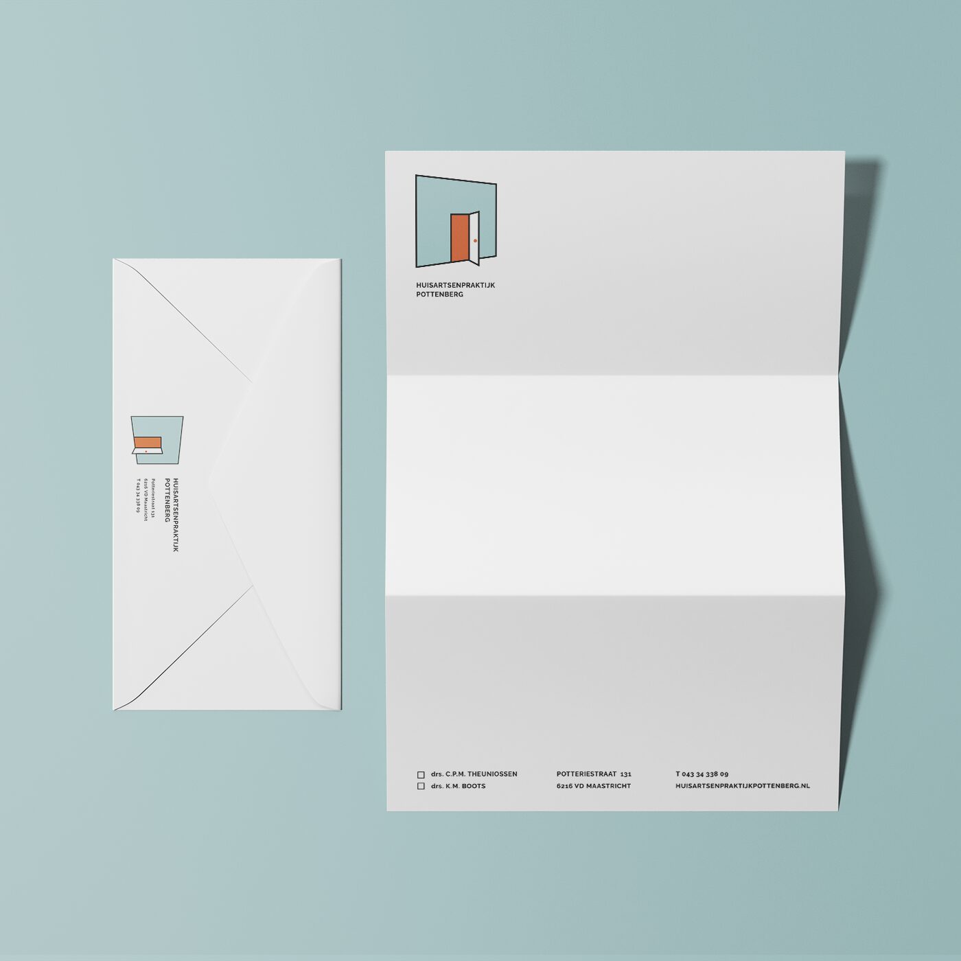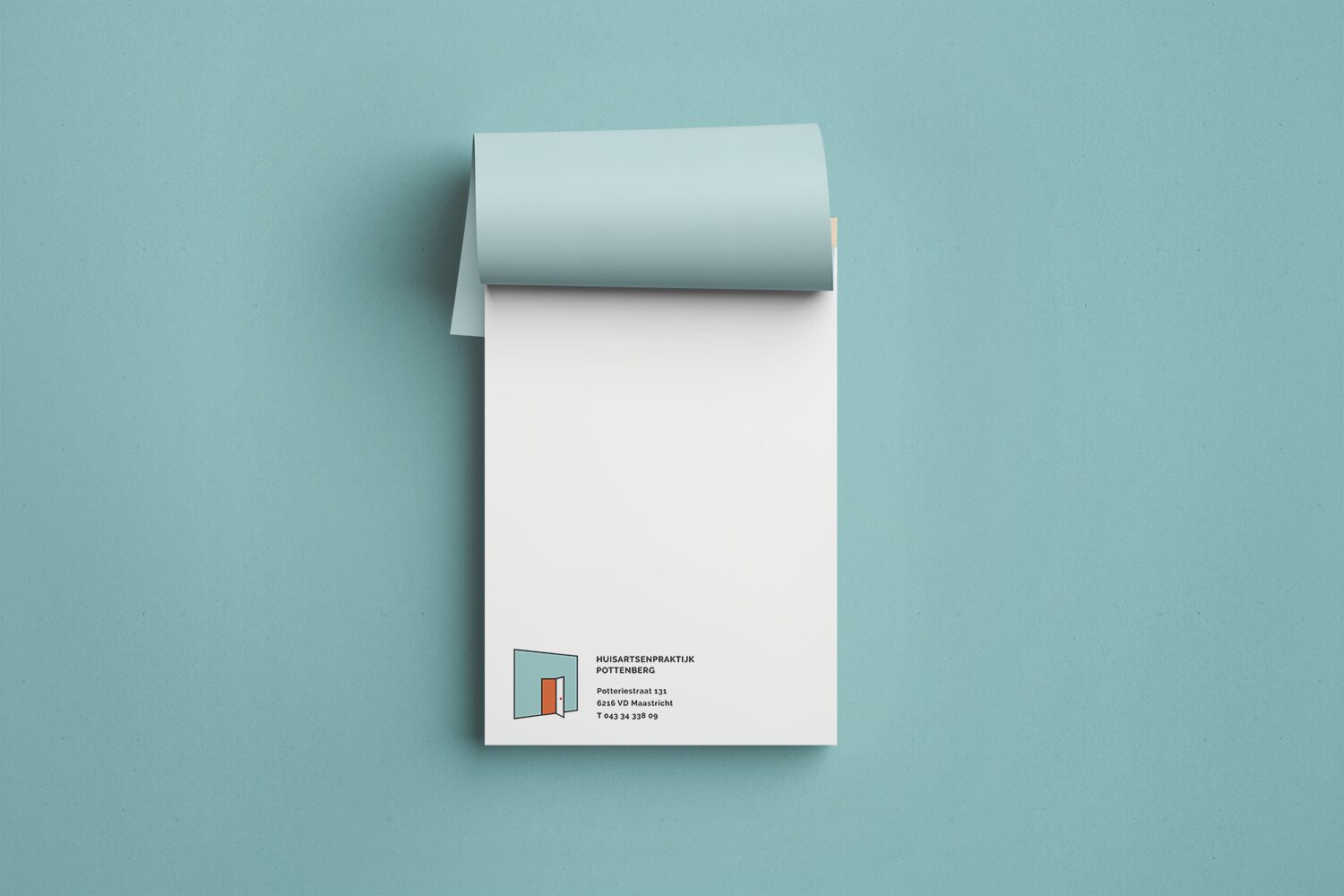 Voor Huisartsenpraktijk Pottenberg ontwierp ik een identiteit die voelt als binnenstappen: het logo is een minimalistische deur op een kier – een knipoog naar de wachtkamerdeur. Iedereen is welkom, laagdrempelig en met vertrouwen als basis. Het kleurpalet is fris en opgewekt: mandarijnoranje en pastelturquoise brengen positiviteit, terwijl strakke zwarte lijnen voor rust en professionaliteit zorgen. De stijl is puur, helder en vriendelijk – van logo en briefpapier tot website-toepassingen en signing.