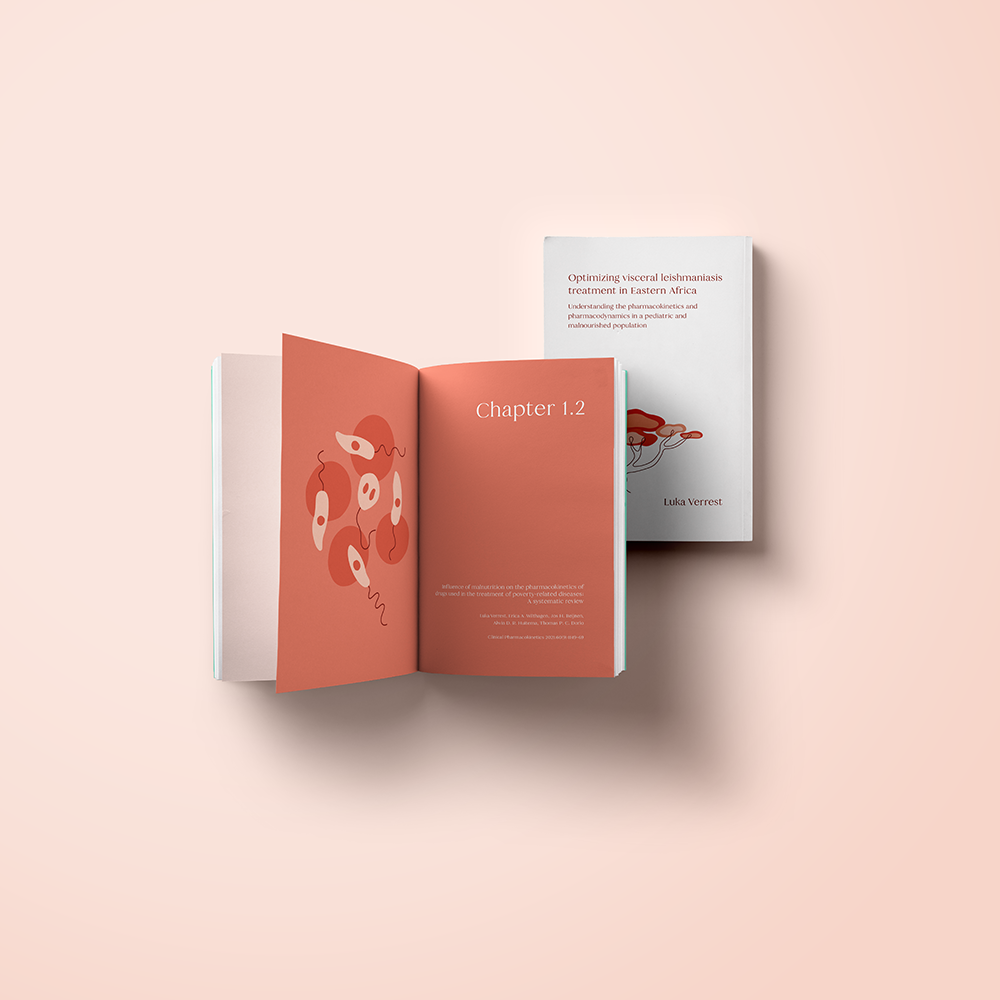 Voor Optimizing visceral leishmaniasis treatment in Eastern Africa: Understanding the pharmacokinetics and pharmacodynamics in a pediatric and malnourished population ontwierp ik een omslag die plaats en onderwerp verbindt. Een Afrikaanse boom in fijne line art staat centraal; de terracotta aardetinten verwijzen naar het landschap én de realiteit van zorg in een kwetsbare populatie. Veel witruimte laten de illustratie spreken.
